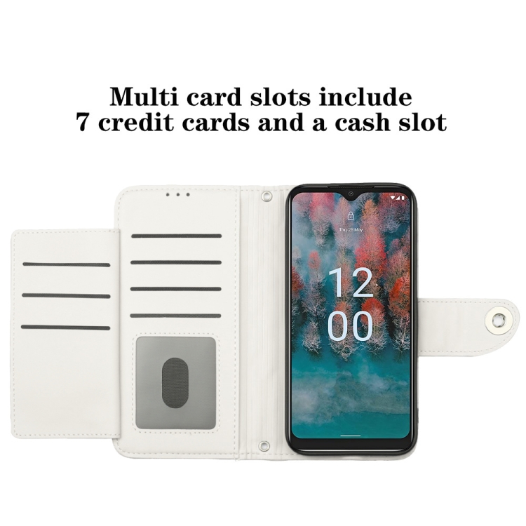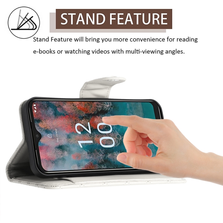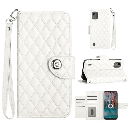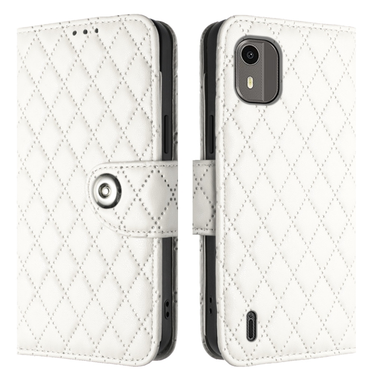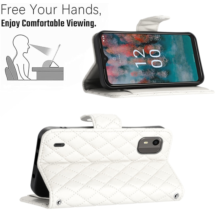 Funda de Cuero para Nokia C12 con Tapa, Textura Rómbica y Cordón (Blanco)