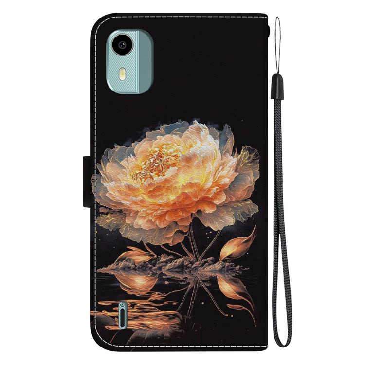 Funda de Cuero para Nokia C12 con Dibujo Coloreado y Textura de Cristal (Peonía Dorada)