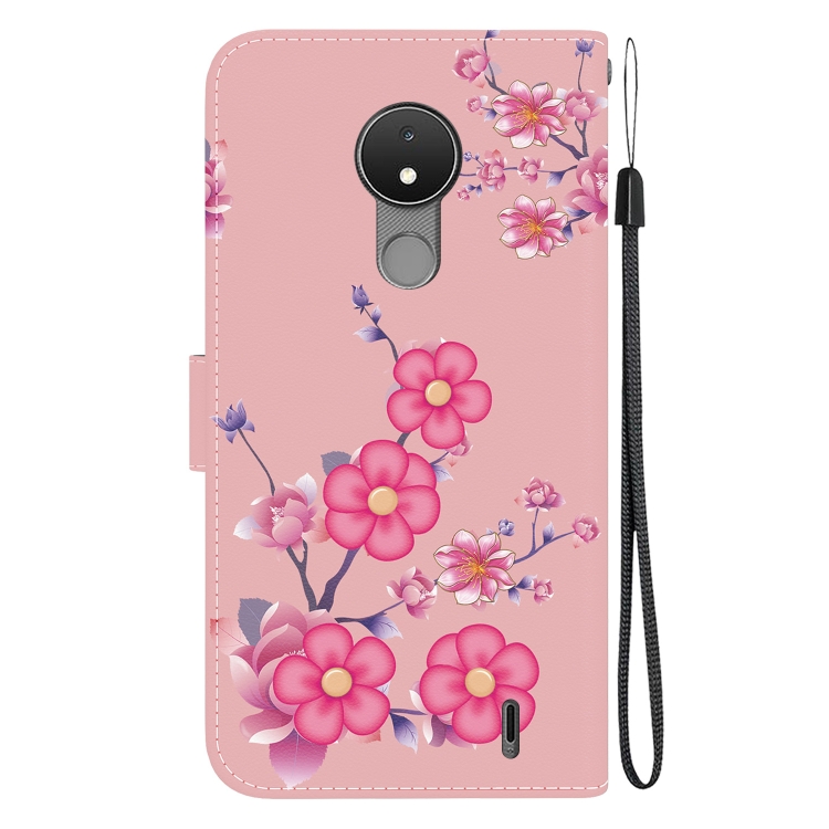 Funda para Nokia C21 de Cuero con Dibujo Coloreado y Textura de Cristal (Flores de Cerezo)