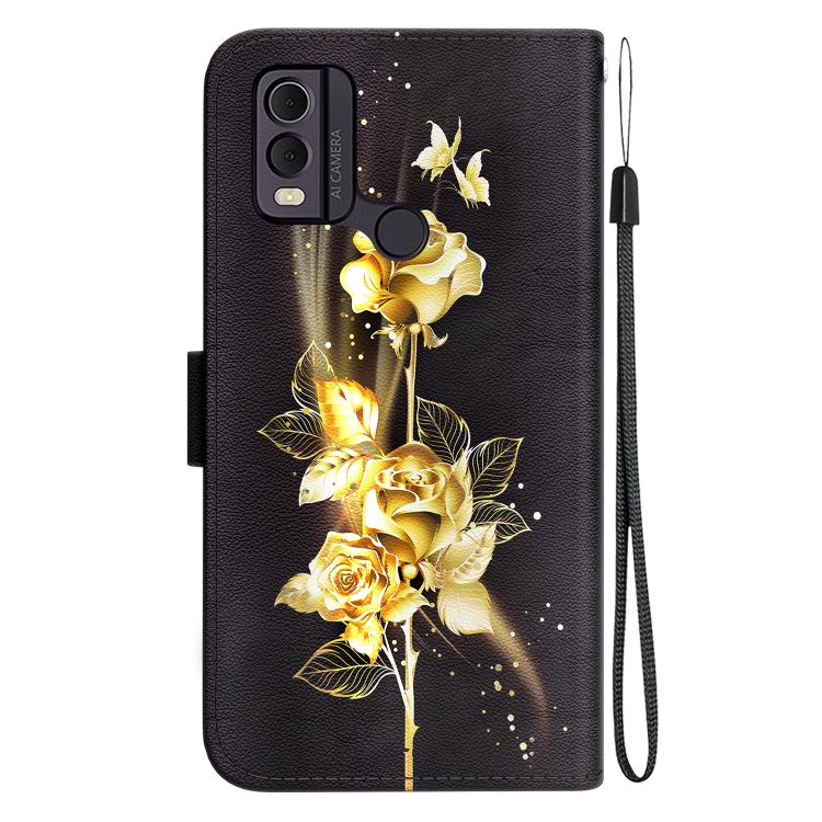 Funda de Cuero para Nokia C22 con Dibujo Coloreado y Textura de Cristal (Mariposa Dorada Rosa)