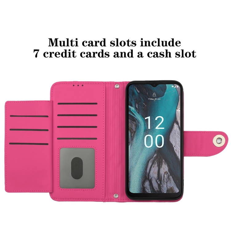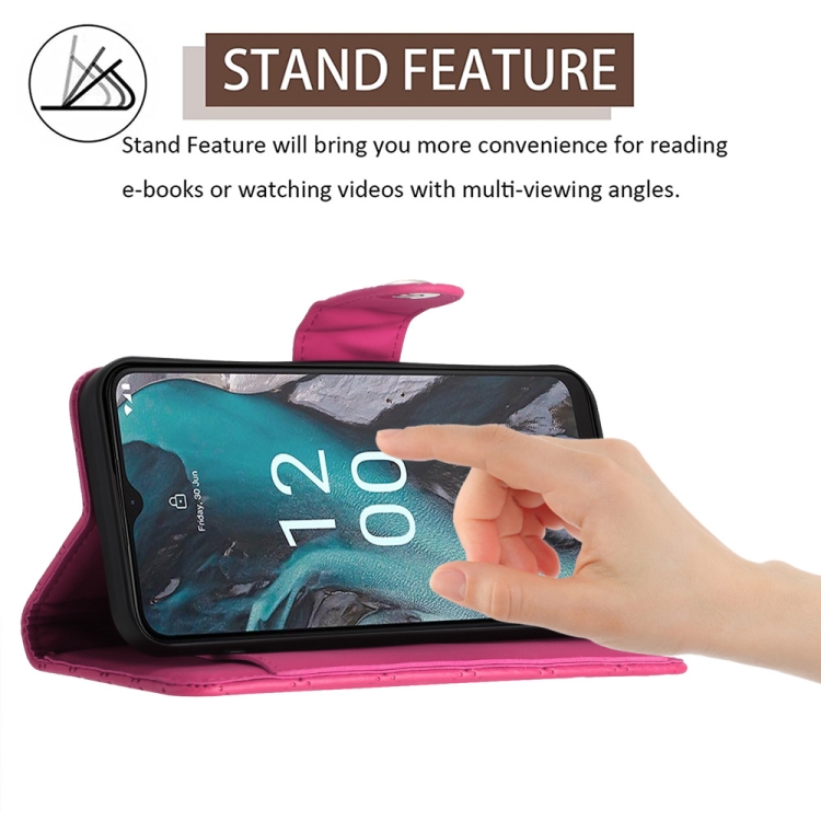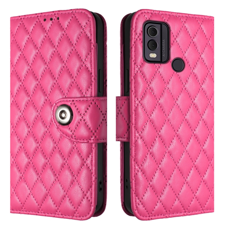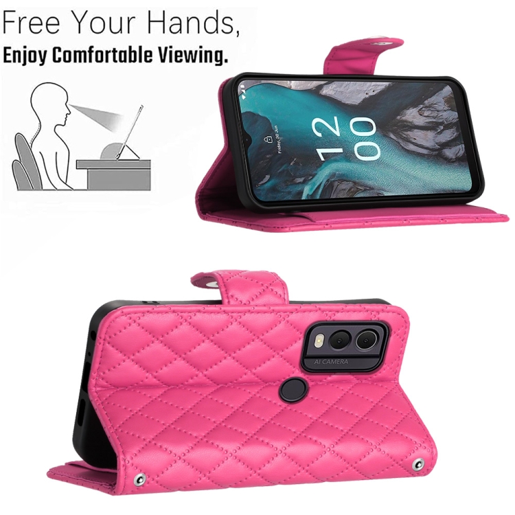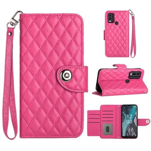 Funda para Nokia C22 de Cuero con Tapa Textura Rómbica y Cordón (Rojo Rosa)