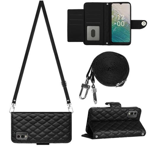 Funda de Cuero para Nokia C32 con Tapa Textura Rómbica y Cordón Largo (Negro)