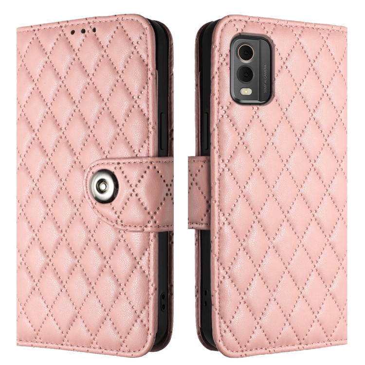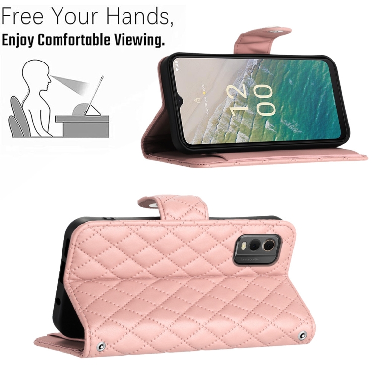 Funda de Cuero para Nokia C32 con Tapa Textura Rómbica y Cordón (Rosa Coral)