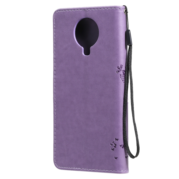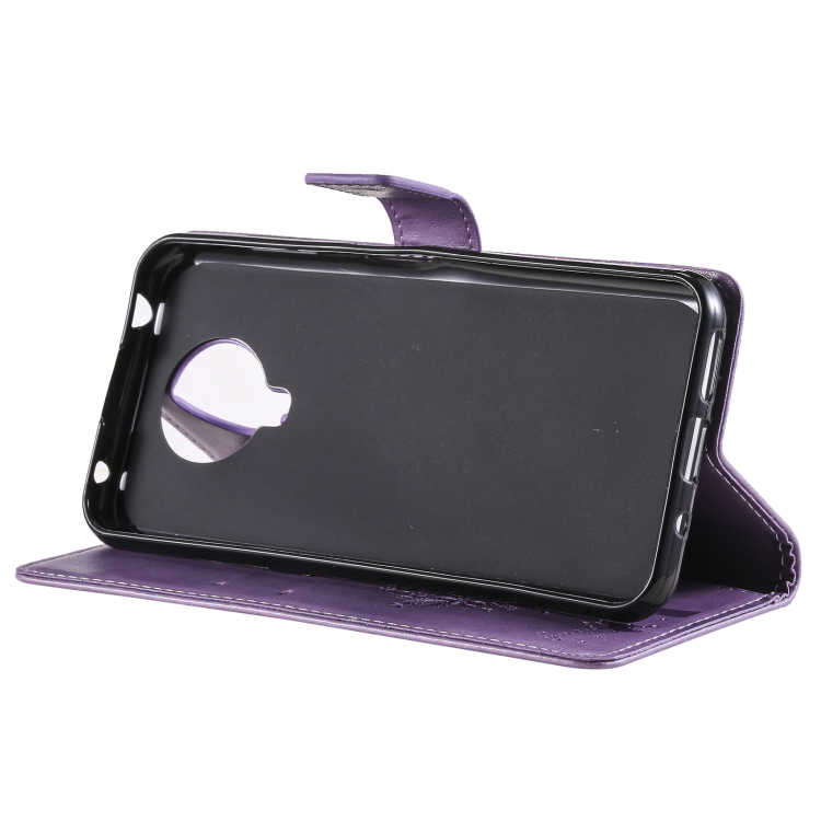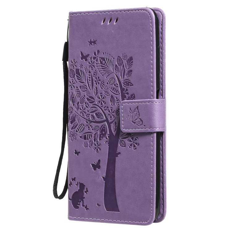 Para Nokia G10 Tree & Cat Pattern Presión prensada Funda de cuero Horizontal Flip PU con soporte y ranuras para tarjetas y Billetera y cordón (lavanda)