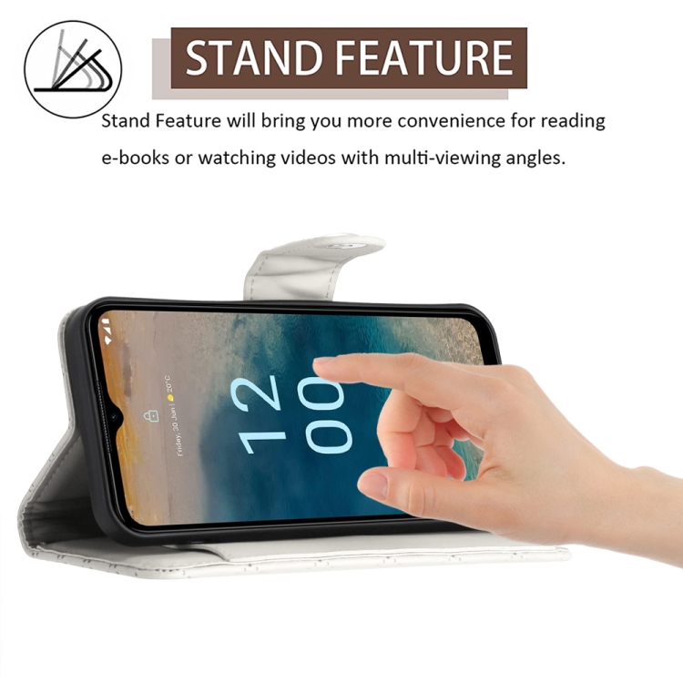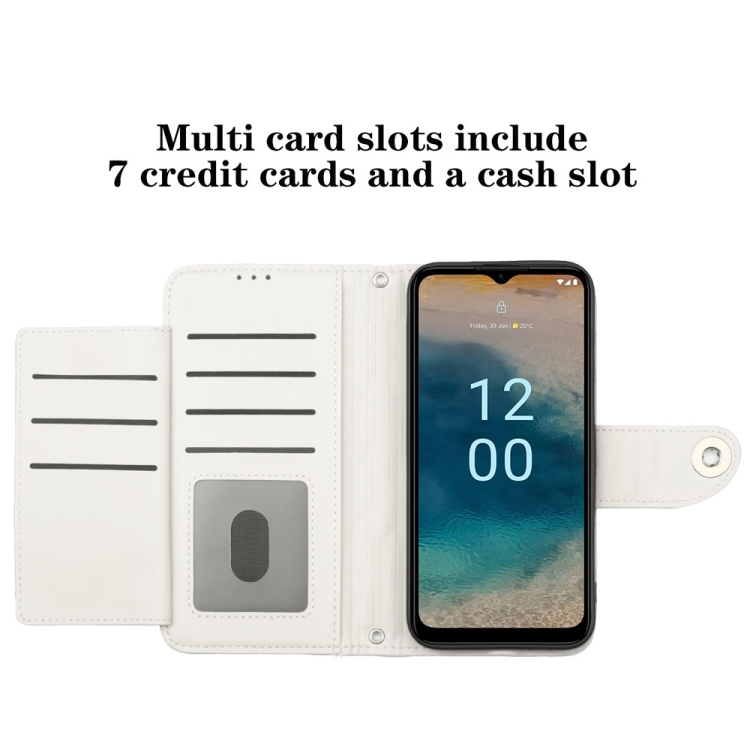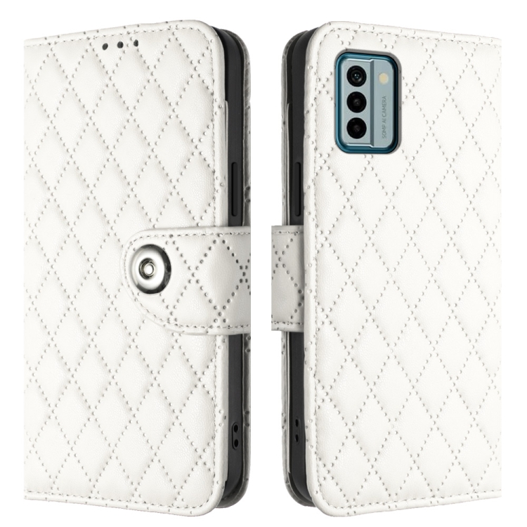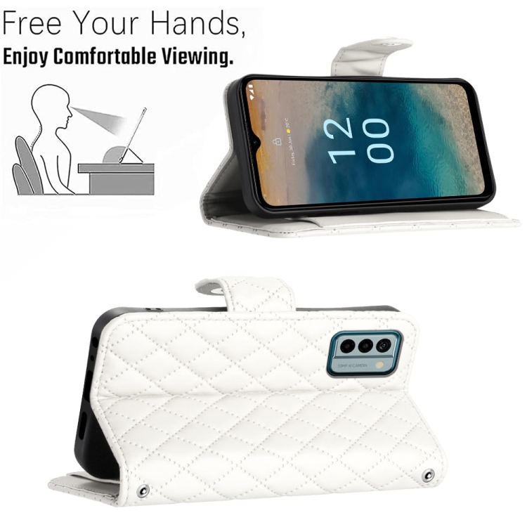 Funda de Cuero para Nokia G22 con Tapa Textura Rómbica y Cordón (Blanco)