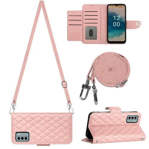 Funda de Cuero para Nokia G22 con Tapa, Textura Rómbica y Cordón Largo (Rosa Coral)