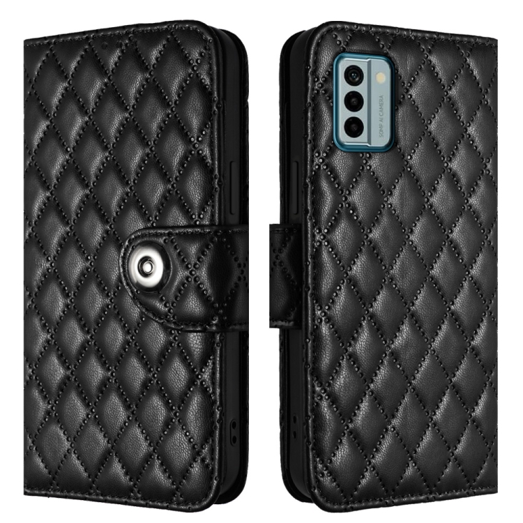 Funda de Cuero para Nokia G22 con Tapa, Textura Rómbica y Cordón (Negro)