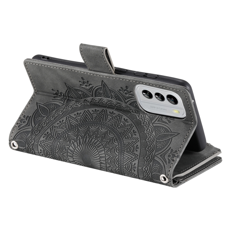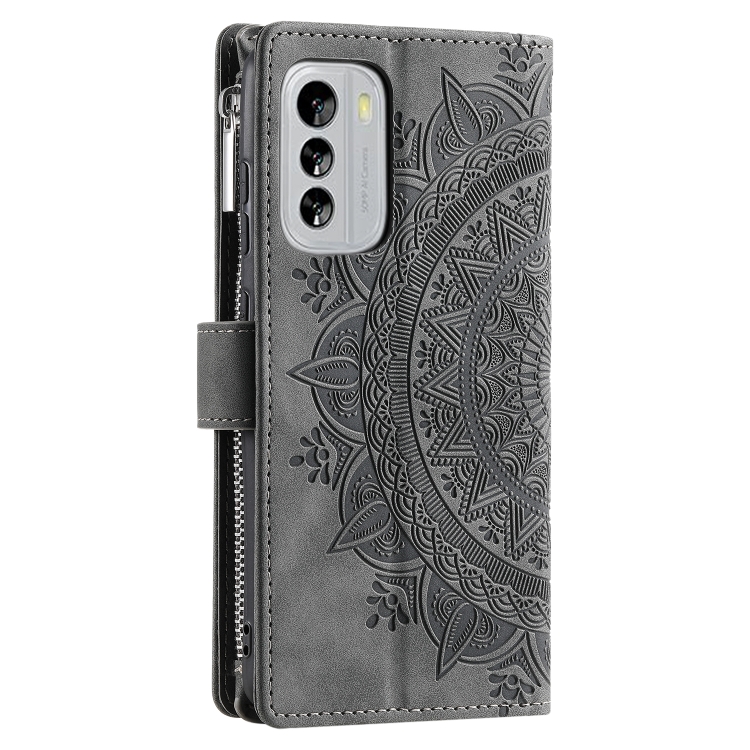 Funda de Cuero para Nokia G60 con Cremallera Totem y Múltiples Tarjetas (Gris)