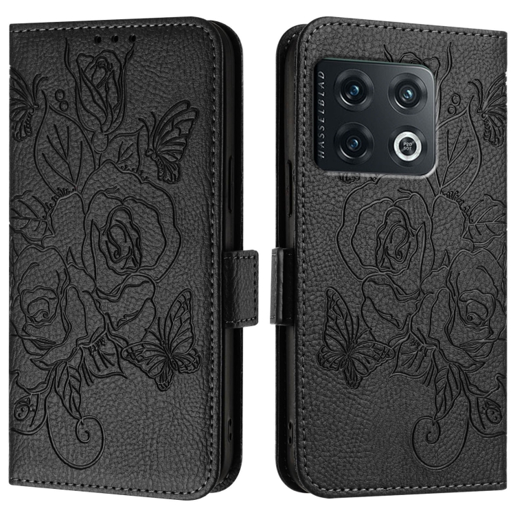 Funda de Cuero Antirrobo RFID para OnePlus 10 Pro 5G con Relieve Rosa (Negro)