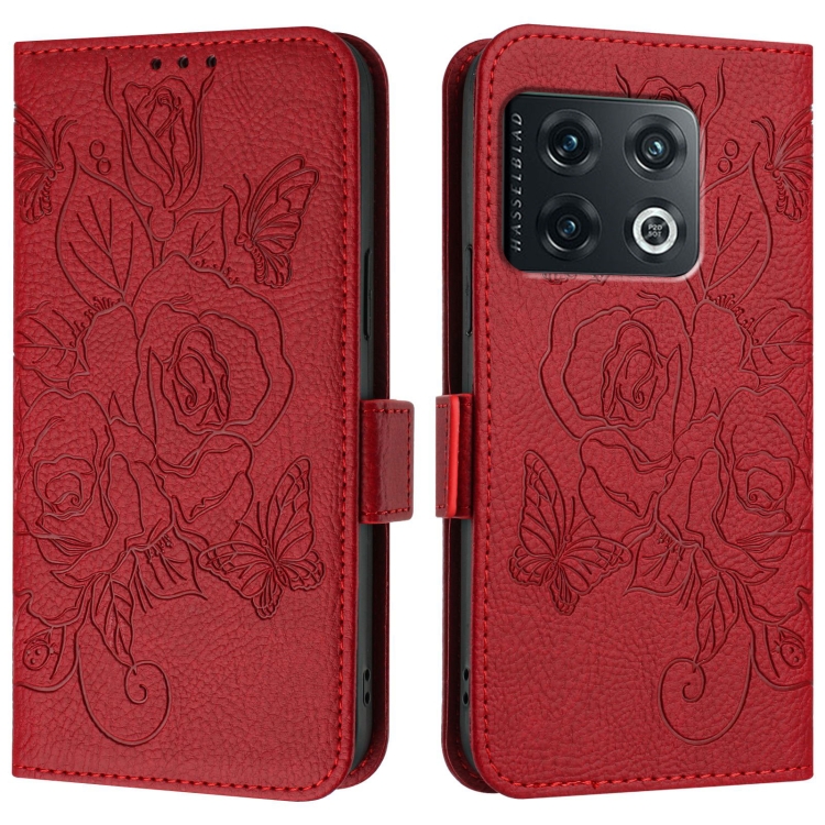 Funda de Cuero Antirrobo RFID para OnePlus 10 Pro 5G con Relieve Rosa (Rojo)