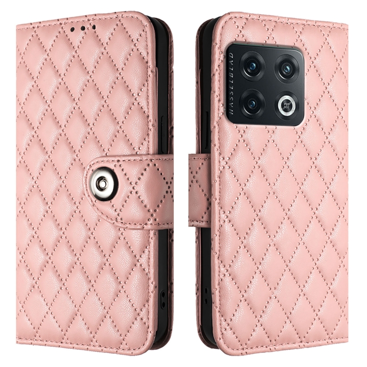 Funda de Cuero para OnePlus 10 Pro con Tapa Textura Rombal y Cordón (Rosa Coral)