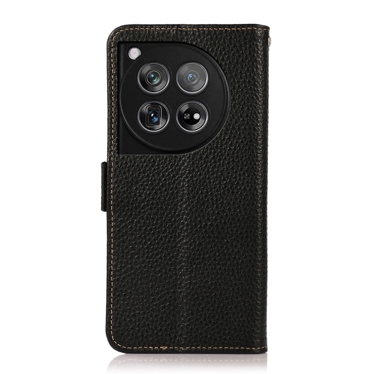 Funda para OnePlus 12 Khazneh Cuero Genuino Litchi Lateral Magnético RFID (Negro)
