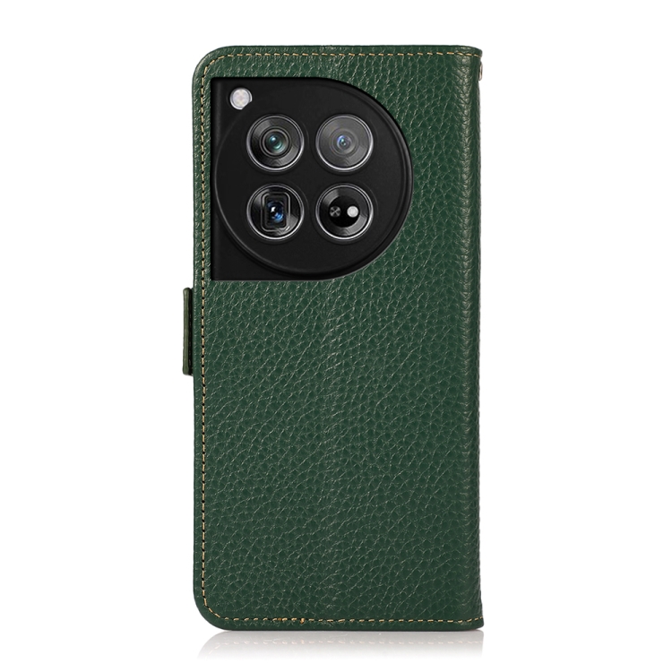 Funda para OnePlus 12 Khazneh de Cuero Genuino Litchi con Protección RFID y Cierre Magnético (Verde)