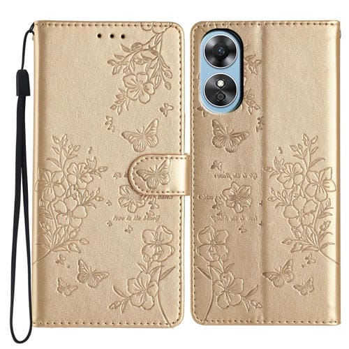 Para Oppo A17 Butterfly Love Flower Funda de Cuero para Teléfono En Relieve (Oro)