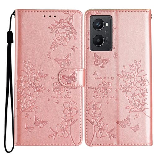 Para Oppo A36 / A76 / A96 Funda para Teléfono de Cuero con Relieve de Flor de Amor y Mariposa (Oro Rosa)