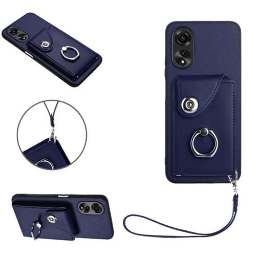 Para Oppo A38 4G / A18 4G Bolsa de Tarjeta de Órgano Global Soporte de Anillo Funda para Teléfono de Pu con Cordón (Azul)