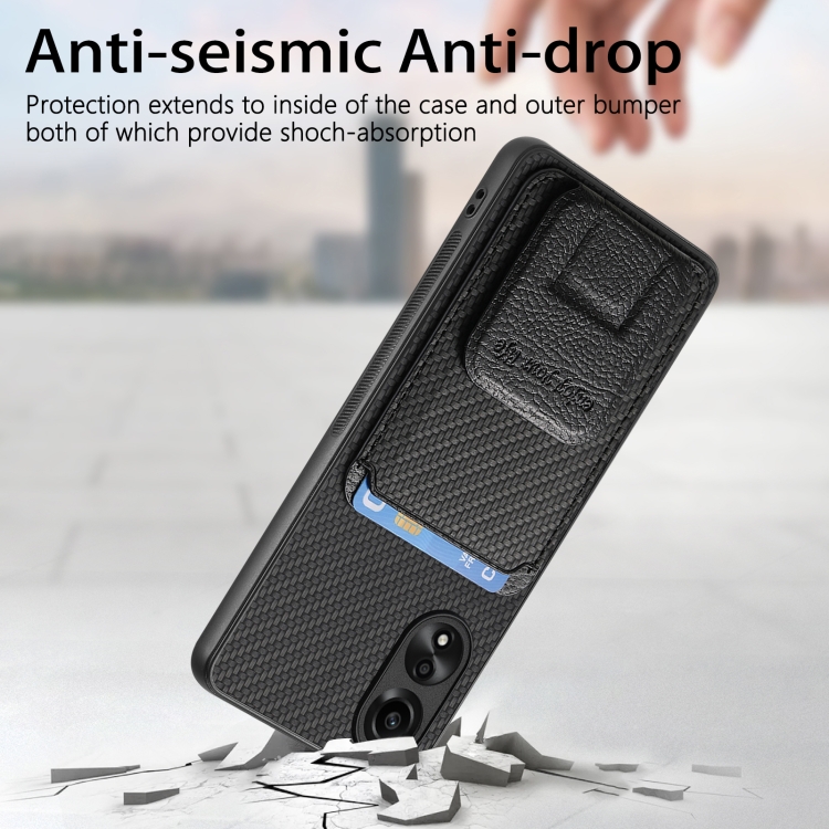 Para Oppo A57 4G Funda para Teléfono con Soporte Plegable y Bolsa para Tarjetas de Fibra de Carbono (Negro)