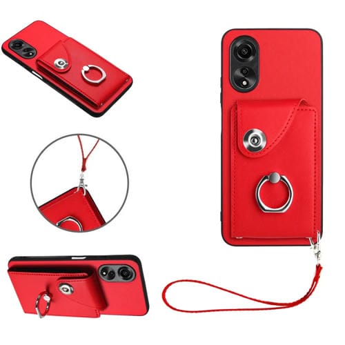 Para Oppo A58 4G Global Organ Card Bag Ring Holder Pu Funda para Teléfono con Cordón (Rojo)