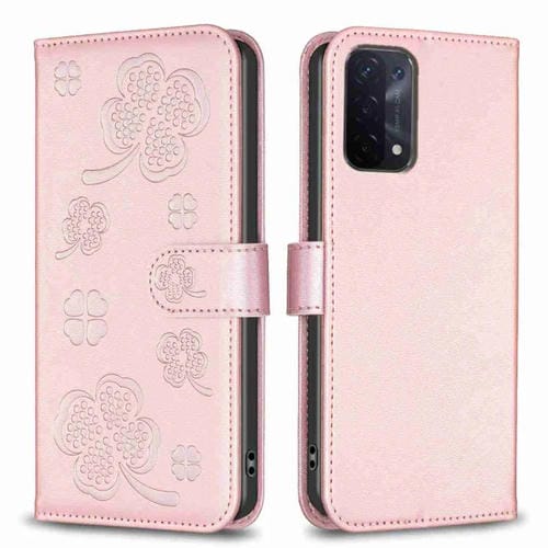 Para Oppo A74 5G / A93 5G / A54 5G Funda para Teléfono de Cuero con Relieve de Cuatro Hojas (Rosa)