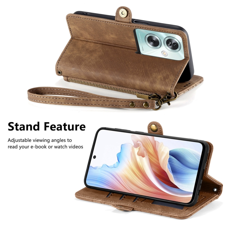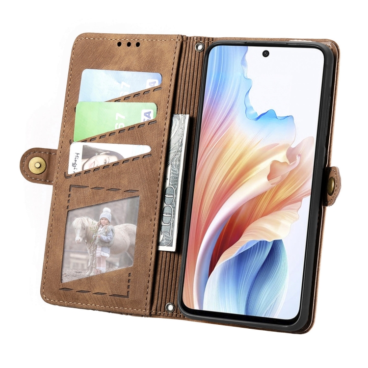 Para Oppo A79 5G / A2 5G Funda de Teléfono de Cuero con Hebilla Lateral y Billetera con Cremallera Geométrica (Marrón)