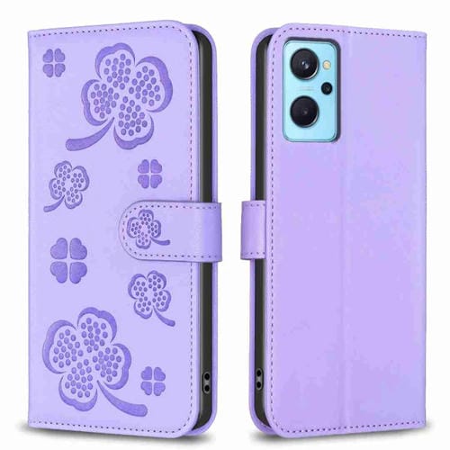 Para Oppo A94 4G / Reno5 F / F19 Pro Funda para Teléfono de Cuero con Relieve de Cuatro Hojas (Púrpura)
