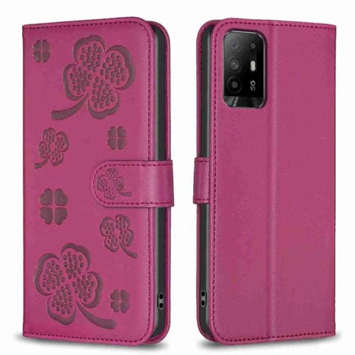 Para Oppo A94 5G / Reno5 Z / F19 Pro + Funda para Teléfono de Cuero con Relieve de Cuatro Hojas (Rojo Rosa)