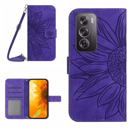 Para Oppo Reno 12 5G Global Skin Feel Funda para Teléfono de Cuero con Tapa En Relieve de Girasol y Cordón (Púrpura Oscuro)