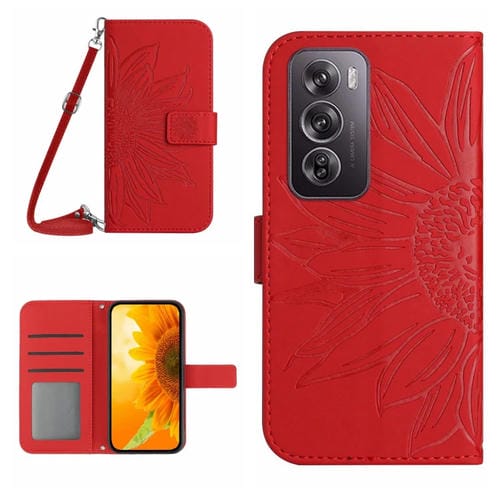 Para Oppo Reno 12 5G Global Skin Feel Funda para Teléfono de Cuero con Tapa En Relieve de Girasol y Cordón (Rojo)