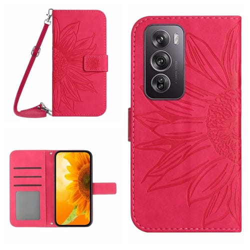 Para Oppo Reno 12 5G Global Skin Feel Funda para Teléfono de Cuero con Tapa En Relieve de Girasol y Cordón (Rojo Rosa)
