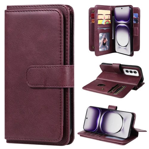 Para Oppo Reno12 5G Cartera Multifunción Global 10 Ranuras para Tarjetas Funda de Cuero para Teléfono (Clarete)