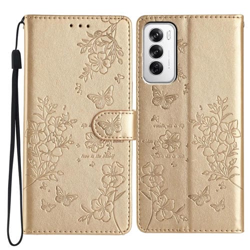 Para Oppo Reno12 5G Global Butterfly Love Flower Funda de Cuero para Teléfono En Relieve (Oro)