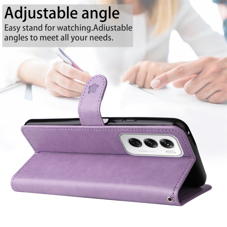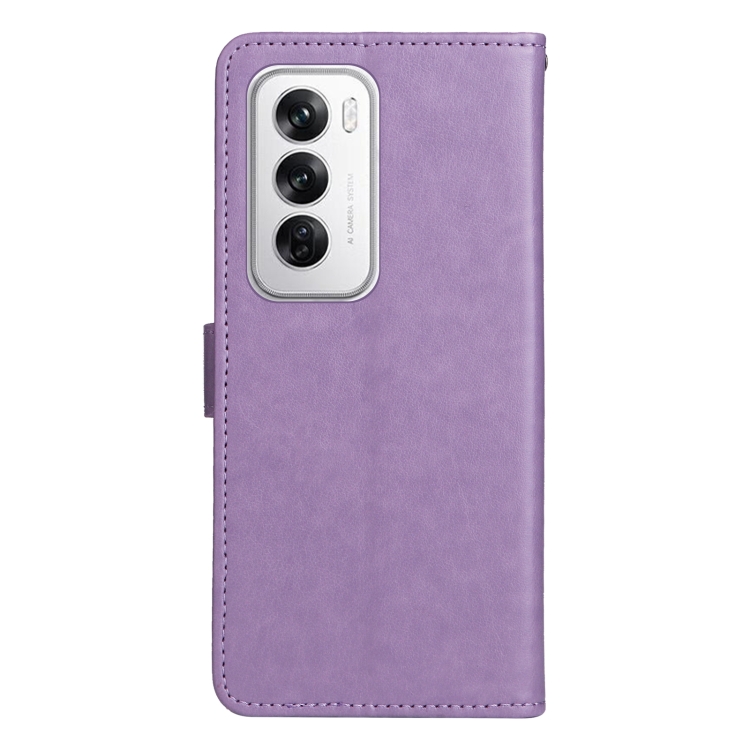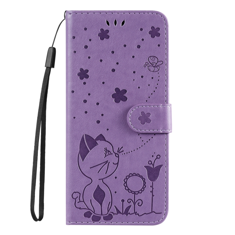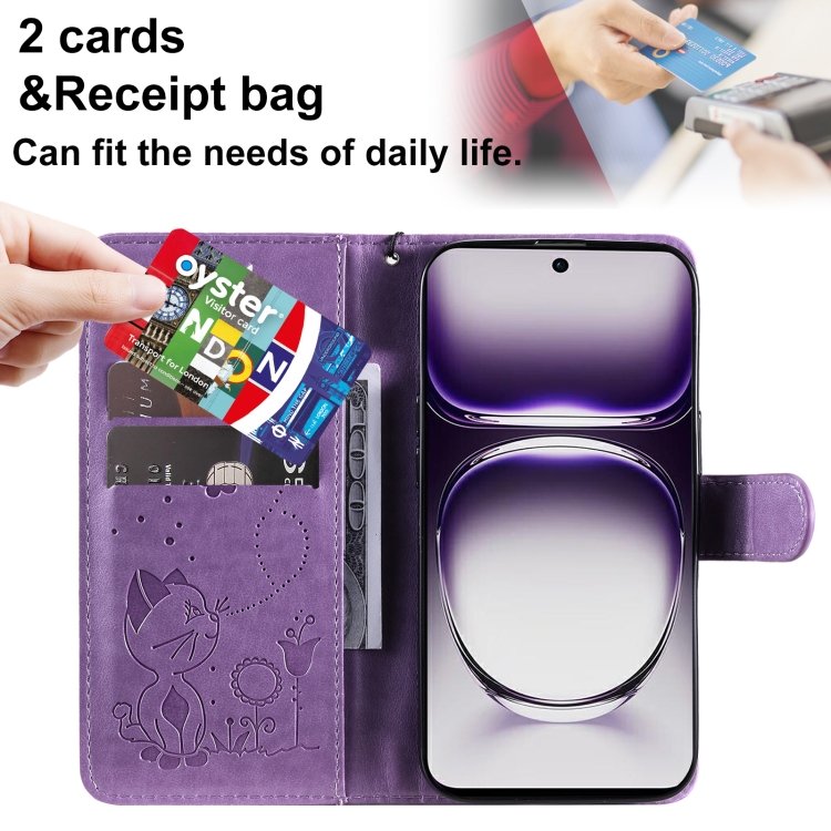 Para Oppo Reno12 5G Global Cat And Bee Funda de Cuero con Tapa En Relieve (Púrpura)