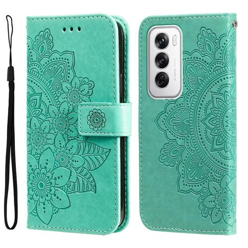 Para Oppo Reno12 5G Global Funda para Teléfono de Cuero con Estampado de Flores de Siete Pétalos (Verde)