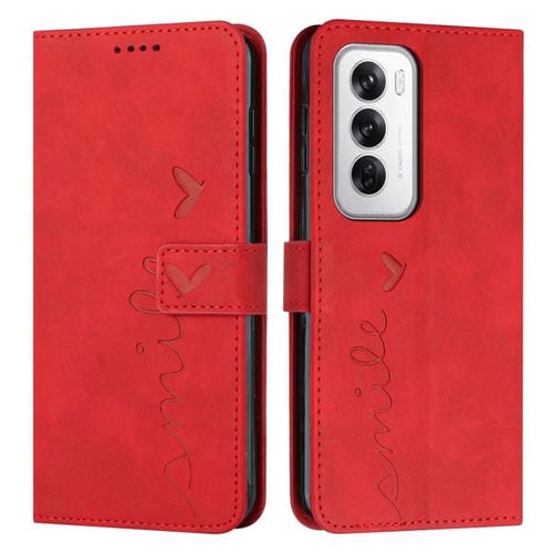 Para Oppo Reno12 5G Global Skin Feel Heart Funda para Teléfono de Cuero En Relieve con Cordón Largo (Rojo)
