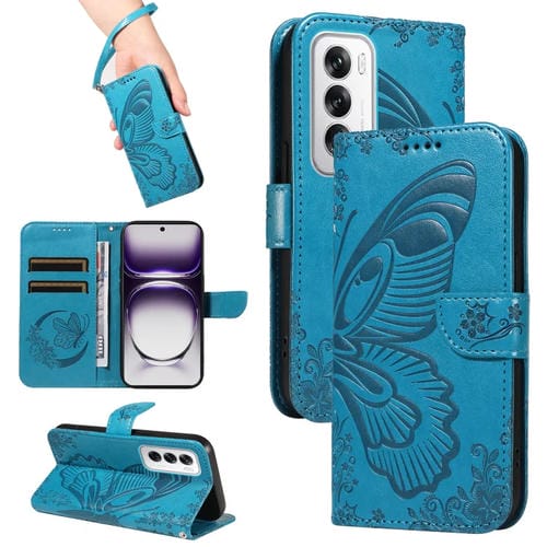 Para Oppo Reno12 5G Global Swallowtail Butterfly Funda de Cuero para Teléfono En Relieve (Azul)
