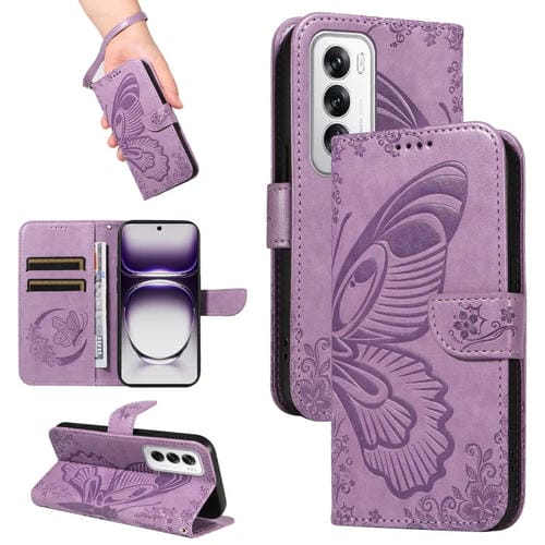 Para Oppo Reno12 5G Global Swallowtail Butterfly Funda de Cuero para Teléfono En Relieve (Púrpura)