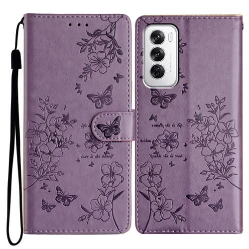 Para Oppo Reno12 Pro 5G Global Butterfly Love Flower Funda de Cuero para Teléfono En Relieve (Púrpura)