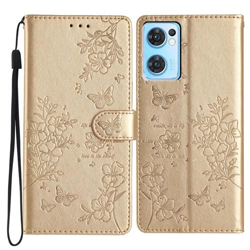 Para Oppo Reno7 5G Funda para Teléfono de Cuero con Relieve de Flor de Amor y Mariposa (Dorado)