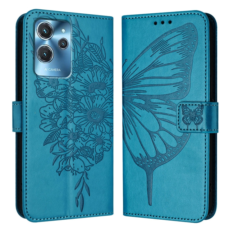 Funda de Cuero para Oukitel C32 con Mariposa en Relieve (Azul)