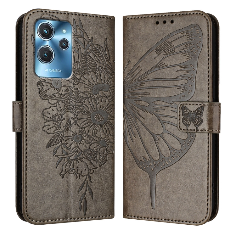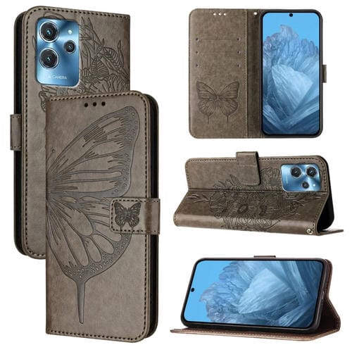 Funda de Cuero para Oukitel C32 con Mariposa en Relieve (Gris)