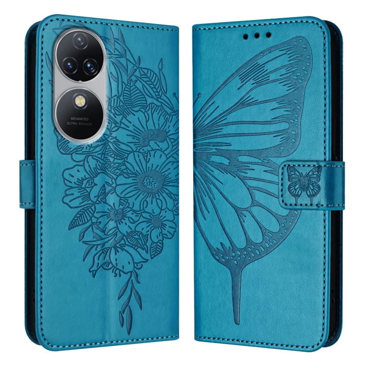 Funda de Cuero para Oukitel C38 con Mariposa en Relieve (Azul)