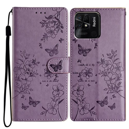 Para Redmi 10C Funda de Cuero para Teléfono con Mariposas y Flores (Púrpura)