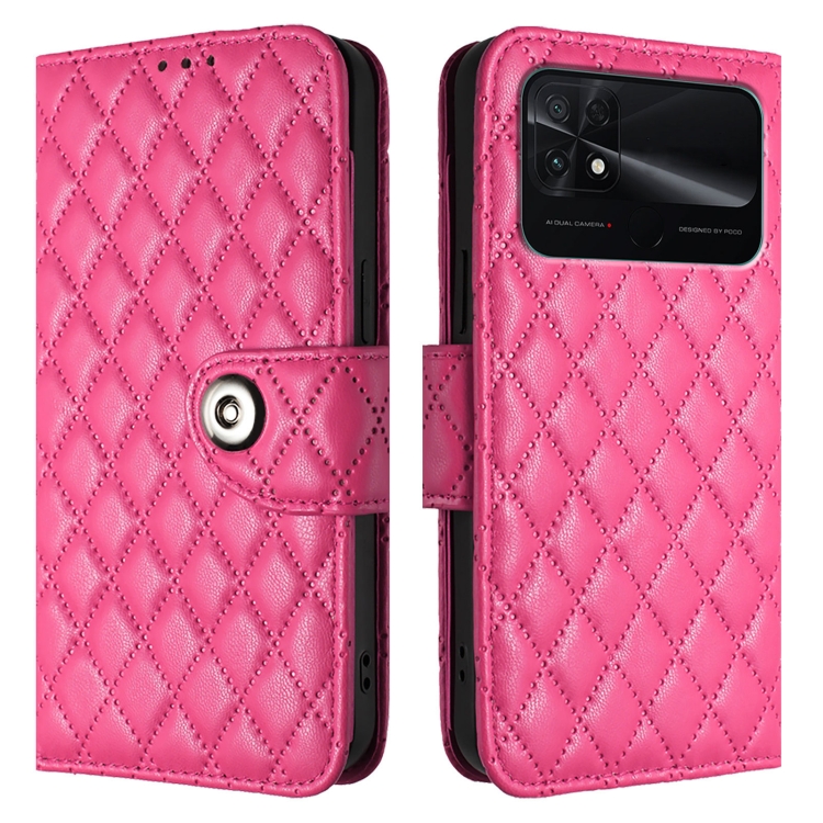 Para Redmi 10C / Redmi 10 2022 India Funda para Teléfono con Tapa de Cuero con Textura Rómbica y Cordón (Rojo Rosa)