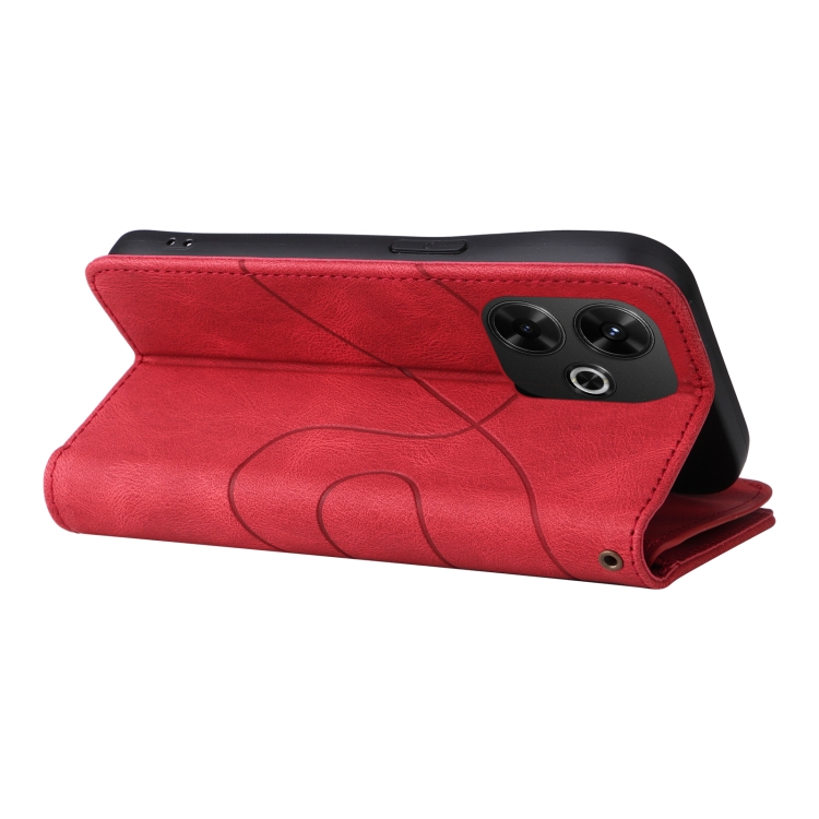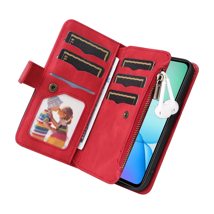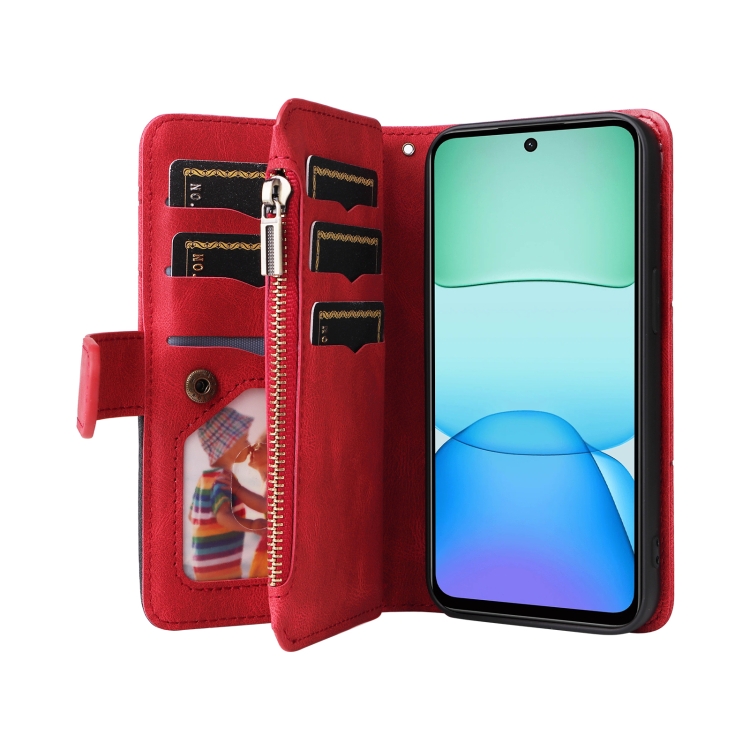 Para Redmi 13 4G Global Funda de Cuero para Teléfono con Billetera con Cremallera y 9 Ranuras para Tarjetas de Dos Colores (Rojo)