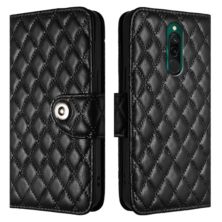 Para Redmi 8 Funda de Cuero con Tapa con Textura Rómbica y Cordón (Negro)