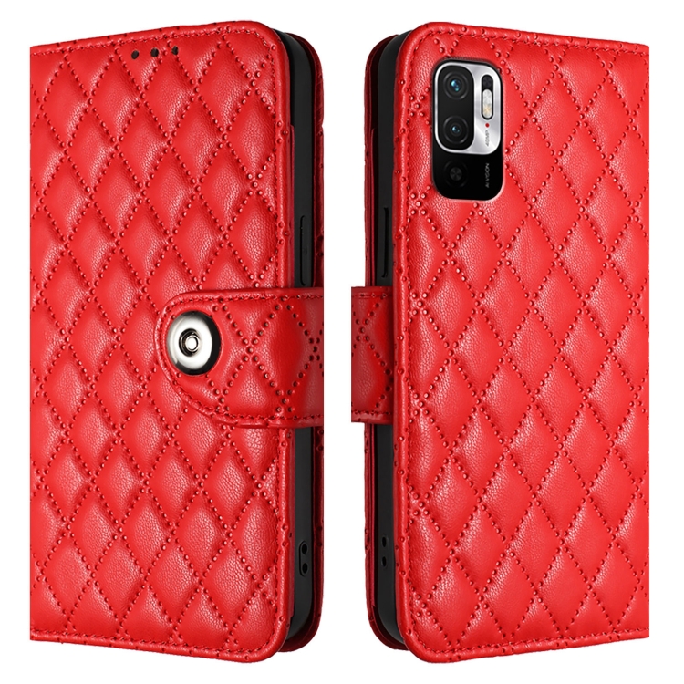 Para Redmi Note 10 5G / Note 10T 5G Funda para Teléfono de Cuero con Tapa con Textura Rómbica y Cordón (Rojo)