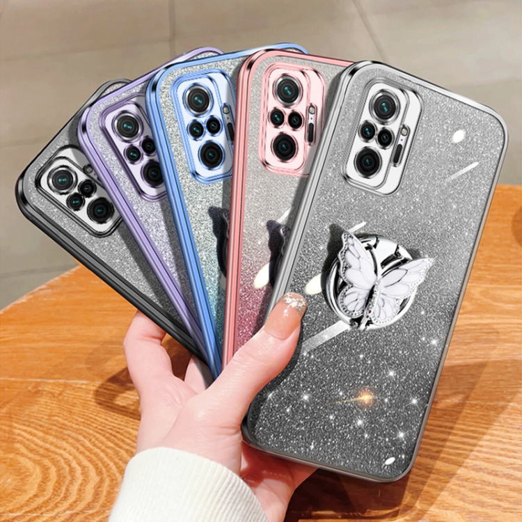 Para Redmi Note 10 Pro 4G Funda para Teléfono de TPU con Soporte de Mariposa con Brillo Degradado Plateado (Plata)