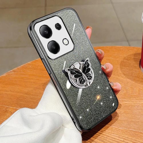 Para Redmi Note 13 4G Funda para Teléfono de TPU con Soporte de Mariposa con Brillo Degradado Plateado (Negro)