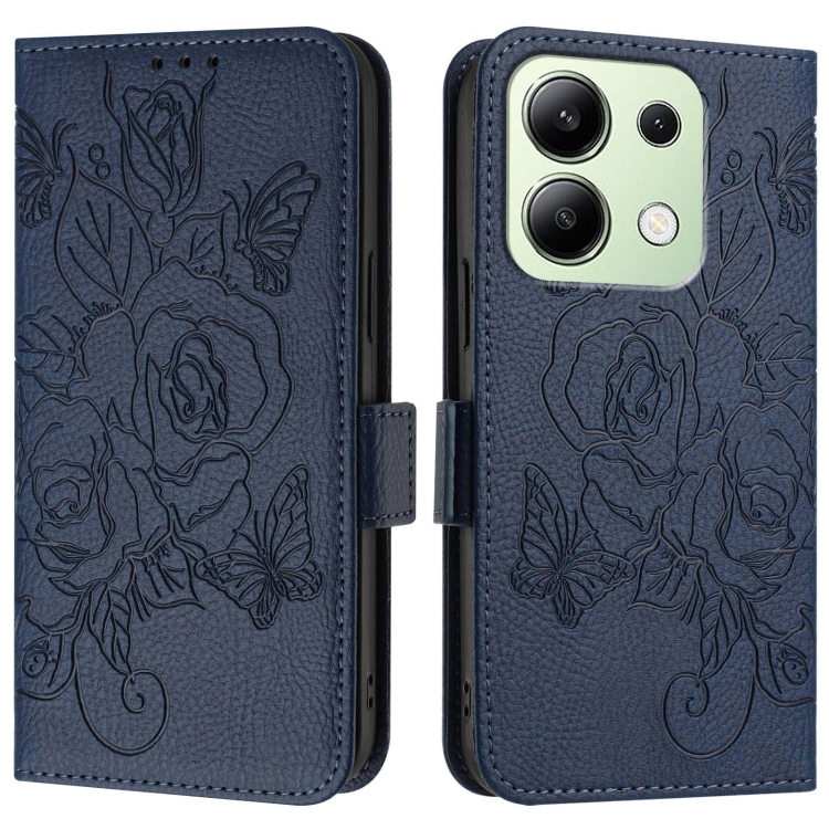 Para Redmi Note 13 4G Global Embossed Rose Rfid Funda de Cuero Antirrobo para Teléfono (Azul Oscuro)