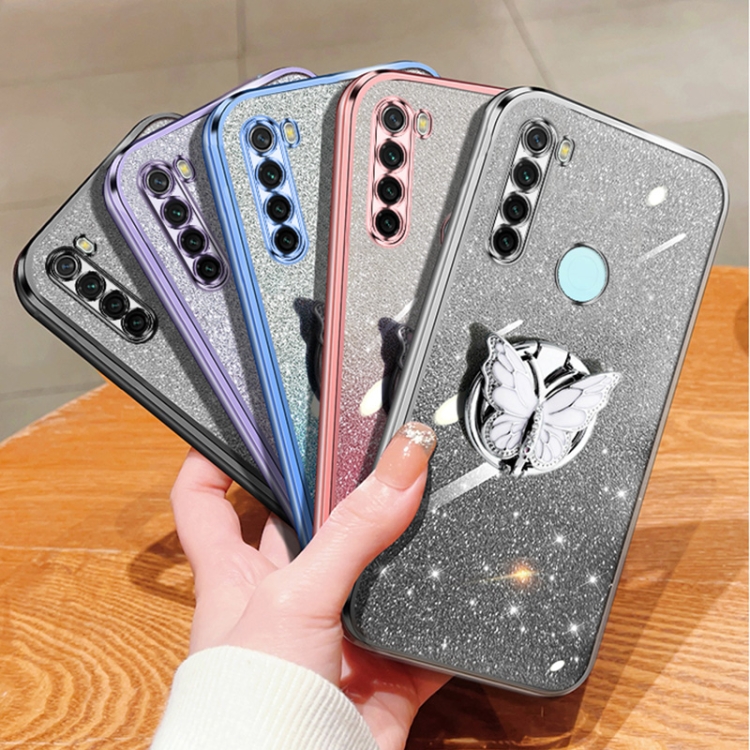 Para Redmi Note 8 Funda para Teléfono de TPU con Soporte de Mariposa con Brillo Degradado Plateado (Rosa)